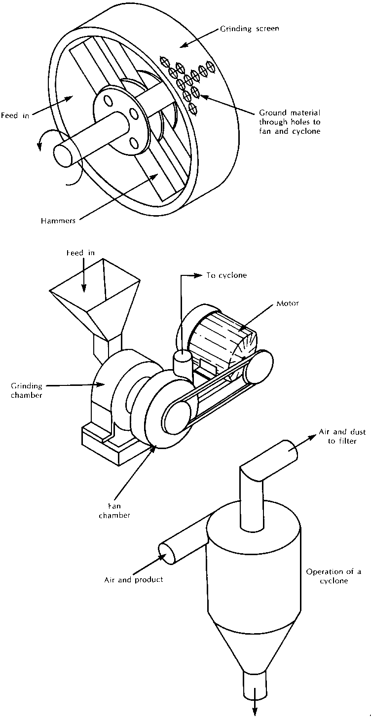 The grinding operation can generate considerable quantities of heat and dust and temperatures of raw materials may increase by at least 10-20°C. For these reasons the process may be a fire- or even an explosion risk particularly if the grinder is not protected against the entry of metal, stones, glass and other objects which can cause sparking. For safety reasons large grinders are often sited in separate brick-built stores on the outside walls of feed mills. If ground material is to be stored in bins or sacks before further processing it is essential that the heat generated during grinding be dissipated. Cooling normally occurs as air is drawn into the grinding chamber, and during the pneumatic conveying of ground material from the grinding screen to its point of discharge, which may be through a cyclone into a bin or mixer. Many small grinders have suction fans fitted to the grinder shaft which bring about cooling and conveying of ground material in one operation. Other grinders discharge directly into conveyors and the air drawn in during grinding is released through filter bags. Grinders may operate in a horizontal or vertical direction according to design.