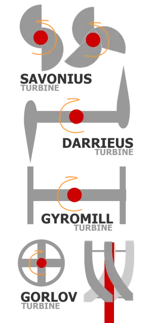 Designs such as the Darrieus, Savonius and Gyromill Turbine are the most common and studied. Newer turbines, such as the Gorlov or helicoidal turbines are just being developed with promising results. Being far more eficcient, cheaper and even structurally stronger than older designs. The helicoidal turbine, mentioned is derived from the Savonius turbine principle, hybridized with the concept of a helicoidal shape.
