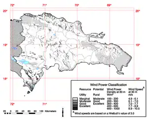 - ↑ Elliot, Dennis L. "Dominican Republic: Most Favorable Wind Resource Areas." Map. Dominican Republic Wind Energy Resource Atlas Development. National Renewable Energy Laboratory. Print.