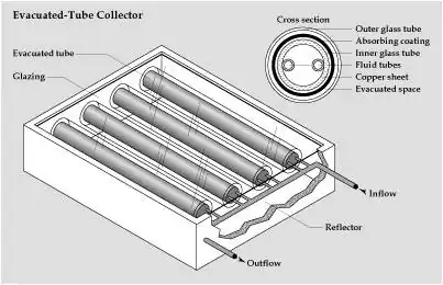 - Each tube contains a glass outer tube and metal absorber tube attached to a fin and covered with a coating that absorbs solar energy well, but which inhibits radiative heat loss