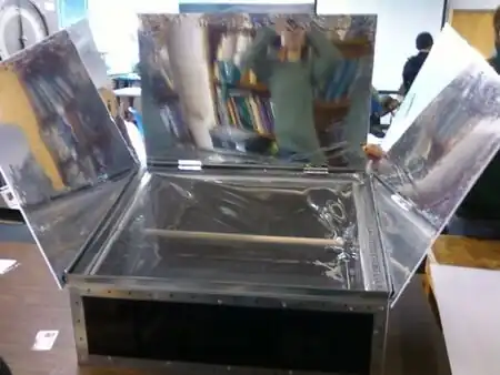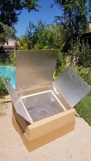 A solar box cooker is basically a large box with a glass lid that will function as an oven. However, the heat losses over a larger surface area will partially offset the additional gain through having a greater heat collecting surface. What is usually done to compensate for this is that a glazed surface cover and reflectors are used to increase the apparent collector area. These reflectors can be made from a variety of materials and their primary purpose is to reflect sunlight through the glazing material and into the cooking space inside of the box.