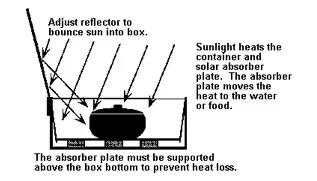 The box cooker consists of some type of heat trapping enclosure, which usually takes the form of a box made of insulating material with one face of the box fitted with a transparent medium, such as glass or plastic. This enables the cooker to utilize the greenhouse effect and incident solar radiation cooks the food within the box. The insulating material allows cooking temperatures to reach similar levels on cold and windy days as on hot days, as well as having an added benefit of blocking any leakages that could potentially seep through and damage the cooker. A dark cooking pot is recommended for cooking as it absorbs the maximum amount of heat and allows for higher cooking temperatures.[8]