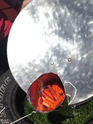 6. Cook your food: Place your food in the pot and close the lid. Place the cooker in direct sunlight, making sure to angle it towards the sun as it moves across the sky. The sun's rays will be reflected by the aluminum foil and concentrated on the pot, cooking the food inside.