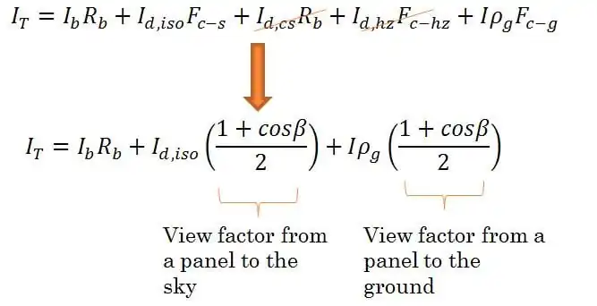 This is the simplest model, and also the most inaccurate. The essential assumption in this model is to assume that all diffuse radiation is isotropic, and the equation can be reduced: