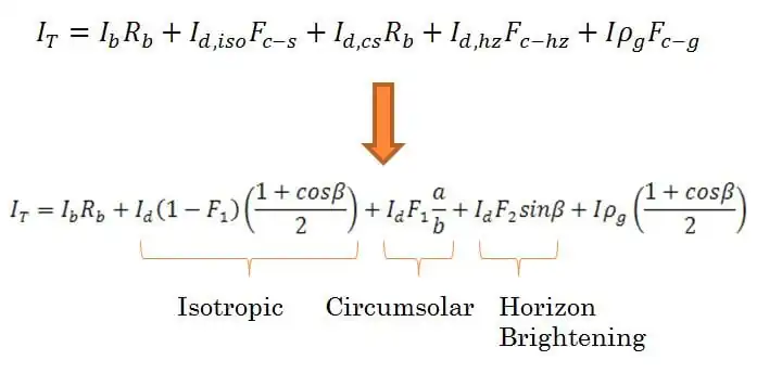 One of the most complex and accurate models for determining total in-plane irradiation, this model uses multiple empirical relations to create a very accurate representation:[8]