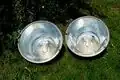 Salvaged stadium light reflectors are able to function as water a heater/pasteurizer, 10 gallon wash basin, and pedestal. The floating aluminum bowl is used to pour water over ones self when rinsing off soap suds. Dr Bronner's liquid soap was used for testing this bathing technique because it rinses off easily without leaving a soap film. The soap is organic, biodegradable and phosphate free. Bathing in this fashion is quite pleasant as opposed to using buckets of cold water. The wooden platform was made by reconfiguring a discarded futon frame salvaged from a scrap wood pile. The wash basin can also be used for washing clothes by hand. The stadium light reflector can heat one gallon of water in a black container to 160 degrees f in 3 hours on a warm sunny day. Several can be used at one time to heat a sufficient volume of water for bathing. The hot water is mixed with cooled water in the wash basin to make it the perfect temperature for bathing outdoors, depending on the air temperature; if the bathing water is warm enough one can bathe comfortably even if it's near freezing cold outside, by frequently pouring hot water (~ 104 degree f) over ones self using the floating aluminum bowl. The stadium light reflectors stack concentrically as nested bowls (para-bowl-oids) for transporting on pallets to be air-lifting to refugees fleeing a war, ethnic cleansing or a natural disaster.