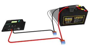 Connect the open ends of the wires from the charge controller to the 3-way lever nuts attached to the battery, matching red with red and black with black. With this connection established, the LCD screen of the charge controller should turn on. Follow the instructions of the charge controller to set it up for your specific battery type (e.g. in this case LiFePO₄).