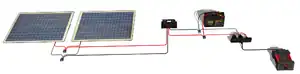 - ↑ Pictured here is the Eco-Worthy 20 Watt Epoxy Solar Panel with 2m Cable & 30A Clip for 12V Camping Battery Charger. Any two similar 12 V nominal ~20 W solar panels will work.