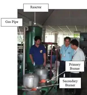 The institutional size rice husk gas stove technology shown in Figure 10 can be used by restaurants, school canteens, small-scale processing industries, catering services etc. Rice husk is gasified inside the reactor, and the gas generated is ignited in the burner to produce a luminous controllable bluish flame for cooking (Belonio, A).