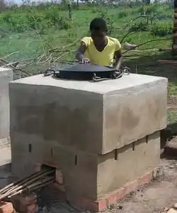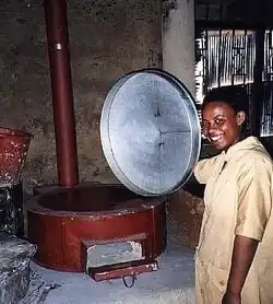 Built of steel and bricks, and insulated with vermiculite (a naturally occurring mineral), the stove burns less wood, reduces smoke exposure of cooks, cooks quicker, reduced drudgery through less time collecting wood and pot working height lifted to waist height.