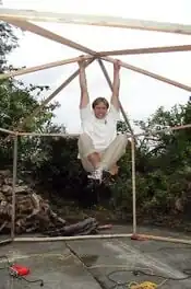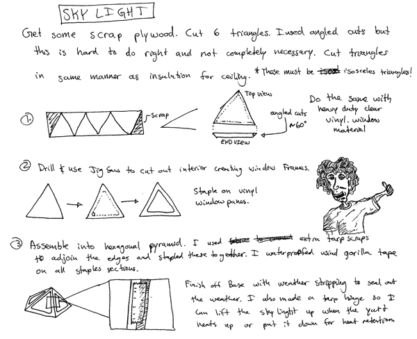 After looking at way too many of other people's roof designs and even building a miniature model I decided on my own creation. I wanted a roof that was all one piece, hence seamless(=rainproof) and it had to be tight fitting so rain wouldn't puddle. This was achieved by cutting out a 20' diameter circle and punching a hole in the very center for the bolt of the apex bracket to fit into. Then I wrestled the beast onto the structure and inserted the bolt into the hole I punched. I then proceeded to staple (use stainless steel staples) the tarp to the vertices. I would pull the tarp tight against the bolt and away from the last vertex to eliminate lateral and vertical slack. I continued around the whole structure, in essence making a cone, until I reached the starting point and had an extra fold of tarp (from all the slack being pulled out elsewhere). I folded this over tightly and marked it so I would know where the fold was when I took it back off to tape (inside and out) the fold closed. I then cut out a hole for my skylight (~3' diam hexagon) and pulled the tarp back off. The fold was taped as well as the border of the skylight with Gorilla tape (like duct tape but much stronger). I also put in 12 grommets along the circumference of the skylight to further tighten the roof cover with rope once it was stapled on. Again I wrestled the tarp back on (it truly is wrestling), stapling it tightly in place. Then I installed hooks on the top side of the rafters and used rope threaded through the grommets and the hooks to tighten the tarp upwards against the eves. Voilá! Done… with the roof that is. I actually also grommeted each vertex pt. on the eve and tightened down in the same manner as the skylight opening, hooks and all.