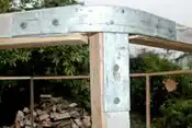 Three rafters were attached to the top layer of the apex bracket only (see "Top view of roof apex bracket" figure above). The remaining rafters were used to support the apex while I screwed them the the vertices of the structure (Aaron wasn't much help, although he's a great supervisor. Russ, buddy, you better make sure this page is on your watchlist, because I will strike back when you least expect it!--Aaron 22:44, 26 November 2006 (PST)). I gave them 1.5' of overhang from the walls to create an eve. Once they were in place I screwed in the bottom portion of the apex bracket. Then I attached the remaining three rafters in the same manner. This forces the structure into a perfect hexagon and can support a substantial amount of weight (see below). Cutting the eve pieces to connect them to the ends of the rafters was more easily said than done. It required funky angled cuts to achieve a snug fit with the rafters. I found the best tool for this was a folding hand saw. I used the scraps from this to incorporate parallel pieces about 3.5' from the roof apex.