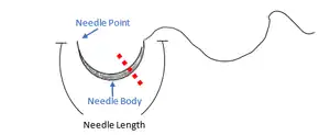 An important concept when suturing is needle point awareness. This means that you should know the needle length and curve of your suture needle so well that you can visualize it traveling within the tissue. To achieve needle point awareness, you must load (attach your needle to your needle driver) at the 2/3rd point along the needle body.