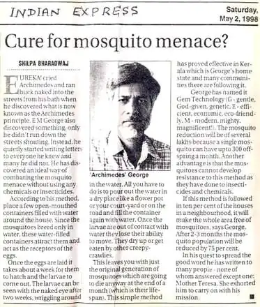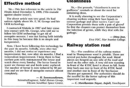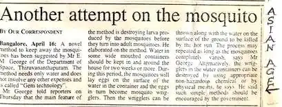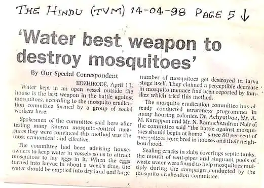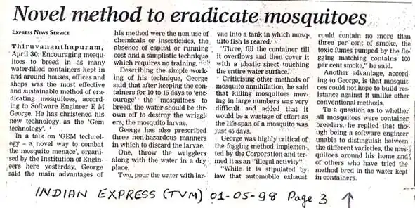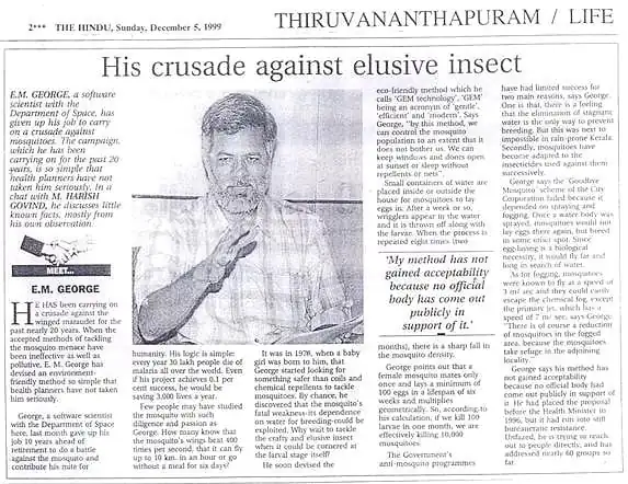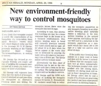 During the 100 & odd classes conducted over the last 1.5 decades on GEM Technology (a process, perfected in 1978, of achieving considerable reduction in mosquito menace in 10-12 weeks time by destroying the wrigglers obtained in micro water bodies provided for laying) for various types of groups of people, a wide variety of questions have come up. The interesting thing is that the same questions that were asked during the first Press Conference held in 1996 at the Trivandrum Press Club were raised in classes held in Aalapuzha, Thrissur & Kollam during Oct 2006 also. Hence the most commonly raised ones are given below. For answers go FAQA