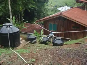 The Rainbow Hostel is located close to Golfito, Costa Rica. This forming community intends to serve as a learning center for social sustainability. A gravity fed, rainwater catchment system supplies all of the water for the main house which includes sinks, showers and toilets.
