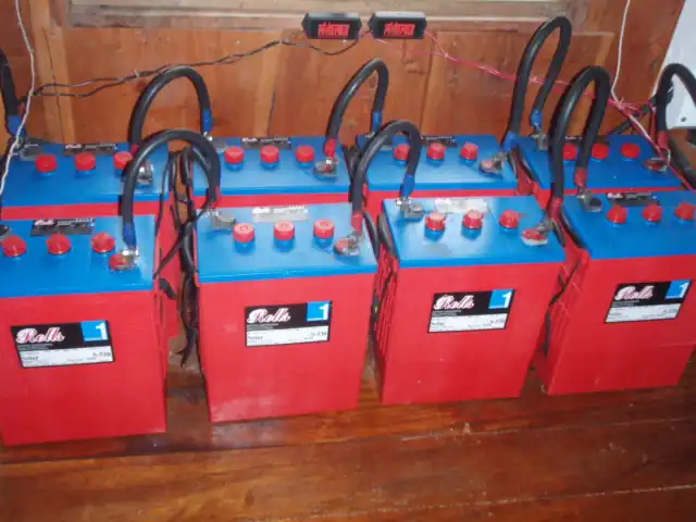 The Batteries are 6 volt Rolls brand. There are 2 rows of 4 batteries wired as a series in parallel. This gives us a 24 volt system. 4 batteries x 6 volts = 24 volt