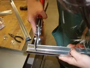 Using tin snips, begin cutting the L-shaped aluminum siding to the correct lengths: 2 @ 9” 2 @ 14” 2 @ 23.75” 6 @ 30” 4 @ 24.25”