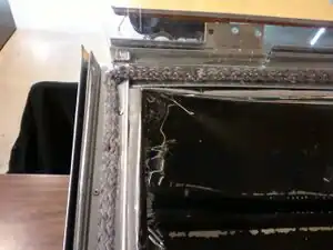 Lower the glass into the frame and slide it upwards so that its upper edge hits the middle of each hinge. Use high-strength epoxy glue that works on glass and metal surfaces to glue the hinges to the outside of the glass. Also, glue a plastic handle to the lower edge of the glass. Allow the glue to fully dry.