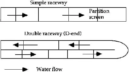 Raceways are concrete canals that can be partitioned with screens. This type of facility is often used for trout farming but is not as suitable for tilapia that prefers the calmer waters of a pond. One must note that is necessary to aerate the water along the entire length of a raceway because the oxygen can often be totally consumed by the fish that are sited at the beginning of the raceway. The complete drainage of a raceway is often difficult because different batches of fish are grown simultaneously in the different sections and the whole of the raceway must be completely empty of fish.