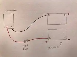 Using a red wire, connect the positive terminal of the inverter to the 150A fuse from step 4. Then, connect the black wire from step 4 into the negative terminal of the inverter.