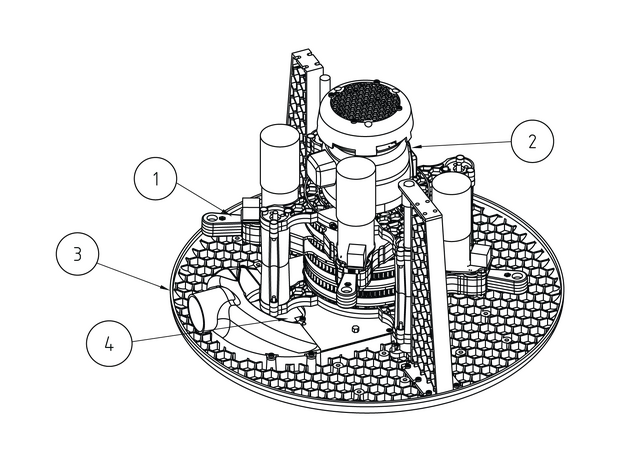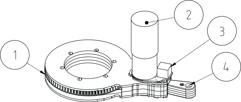 Arm of Maslow4. (1) - main belt spool, (2) - DC motor with gearbox that drives the main spool, (3) - encoder PCB, (4) - belt endpiece