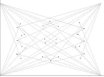 Maslow4 starts with the approximate values for the XY coordinates of the anchor points. First we retract all 4 belts to the zero position, to calibrate the zero length position for the belts. The belts are then extended and fixed to the points, and Maslow begins to mover through a 10x10 grid of points scattered over the center of the working area. At each of the points, machine retracts two of the bottom belts till they are under tension, detecting tension using the current feedback from the motors. It then takes measurements for the lengths of tensioned belts at each of the points. We get a 100 sets of belt lengths this way.