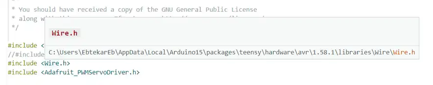 1. Open the hand-control code, and in hand-control. tap, pause the mouse over the Wire.h library. Location folder will be displayed.
