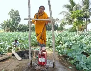 A treadle pump is a human-powered Pump designed to lift water from a depth of seven meters or less. A treadle is a lever device pressed by the foot to drive a machine, in this case a pump. The treadle pump can do most of the work of a motorized pump, but costs considerably less (75%) to purchase. Because it needs no fossil fuel (it is driven by the operator's body weight and leg muscles, it can also cost less (50%) to operate than a motorized pump. It can lift five to seven cubic meters of water per hour from wells and boreholes up to seven meters deep and can also be used to draw water from water sources such as lakes and rivers. Many treadle pumps are manufactured locally, but they can be challenging to produce consistently without highly skilled welders and production hardware.