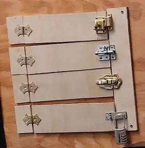 The lock puzzle is the feature most worthy of operational instructions. Each of the first 3 flaps at the top are flipped outwards by opening a lock, and each flap reveals a number, which, when put together, yield the combination for the lock containing the fourth flap.