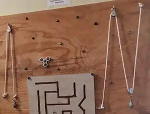 Most of the features for the board required preparation before they were fixed to the board. The padlock was cut from a 1/8 sheet of plywood and attached to the board with screws and hinges in such a was that the flaps open freely but close in place to be re-locked. Gear exhibit #1 was repurchased from amazon, and it needed some preparation before installing. The magnetic pieces inside the gears that were there to make it potentially attachable to a magnetic surface such as a refrigerator had to be removed, and a bolts were inserted in their place. The holes had to be pre-drilled and the bolt screws inserted by hand. Since the gears require such a high level of precision, there were one or two erroneous holes that had to be re-drilled, but the gears functioned effectively after completion. The Newton's Cradle was pre-purchased as well, and it was notable one of the more flimsy items on our board. To enhance its strength, we had workers who happened to be present at Jordy's house at the time cut very specifically sized pieces of wood to fill the black areas between the frame of the Newton's Cradle. These were then glued on with wood glue to the frame. The final Newton's Cradle was wood-glued to the board, which unfortunately proved to be an unsuccessful solution. Much like gear exhibit #1, the Fidget Spinners had to have their center piece removed so a bolt screw could be threaded through them. The ball bearings which allow the fidget spinners to spin were kept in place. The fidget spinners, especially with the board in a vertical orientation, spin effectively on these screws. The Whiteboard was obtained through a friend of ours and was attached with wood glue. The markers are held on through magnetism. The Trillium Flowers were among the last items included on the final product. They were painted to the area around the bottom of the board with purple and white paint to reflect the natural color of the Trillium flower. The stems were painted on after the above photo was taken. The Pulley exhibits had to be attached to the board with the projected motion of the weights and ropes in mind, as they would potentially infringe on other features. A nylon rope is threaded through a pulley at the top in pulley exhibit #1, and at the top and bottom in pulley exhibit #2. Both ropes are tied at one into a knot to ensure the rope does not fall through the pulley and become dysfunctional. The plastic loops which contain the tied ends of the rope have since been replaced with metal loop screws. The fishing weights have also been replaced with similarly weighted but differently composed items due to failure to meet the safety criteria. The Peg Maze was cut from the same 1/8 piece of plywood as the lock puzzle. The track was drawn out before cutting, with enough space left on all sides to account for the spacers which would have to go between the maze and the board. It was cut with a plunge router. The peg was created with about 4 in. of a dowel attached with a screw to a small (~1 x 1 in) piece of wood. The wood piece is between the peg maze and the board, on the same elevation as the spacers, to contain the peg inside the maze. Gear exhibit #2 was pre-purchased and glued onto the board with wood glue. The handle of the Padlocks were threaded through loop screws and another metal implement, with much care given to the design such that the students could open the lock without taking it off the wall. The Rotating Hourglass was pre-purchased, but the mounting solution was a topic of much discussion. The final solution is a small wooden piece, 1/8 in, attached to the board with a screw but not tightly, such that it can still spin. This wooden piece is attached at both ends to the hourglass, such that the hourglass can rotate on the rotating wooden piece.