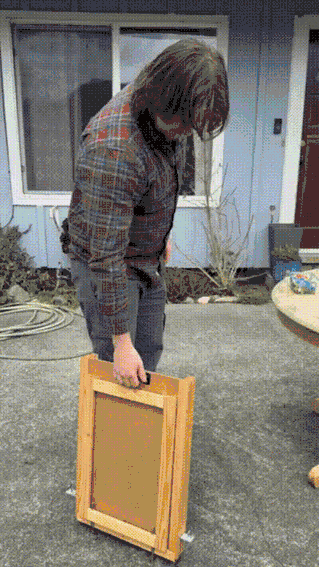 With the completion of the display frame, a prop mechanism was constructed with 1x2 inch cedar planks to create a rectangular perimeter. The prop mechanism was then screwed into the back of the display frame using metal hinges that would allow it swing open and allow the board to stand.