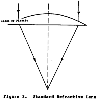Standard circular and Fresnel lenses are also point focus concentrators. The Fresnel lens has been utilized in conjunction with photovoltaic cells in several test installations in the United States and abroad.