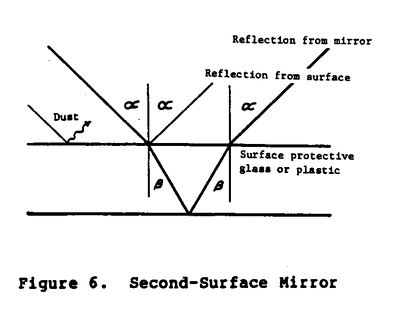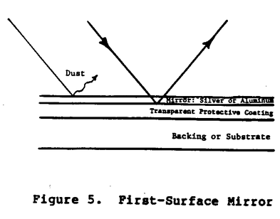 Each method of concentration has drawbacks. The mirror requires a clean smooth reflecting surface: clean since dust particles could scatter light away from the receiver or the light could be partly absorbed by a thin dirty film; smooth because contour error can also result in missing the receiver. The reflecting material may be placed on the surface of the mirror (first surface, Figure 5), or behind a transparent surface (second surface,