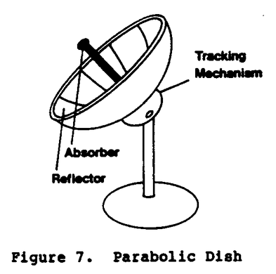 The parabolic dish reflector (Figure 7) utilizes the optical properties of the parabolic curved surface to concentrate direct light to the focal point. The dish geometry is familiar being used for automobile headlights, searchlights, radar, and to receive transmissions from broadcast satellites.