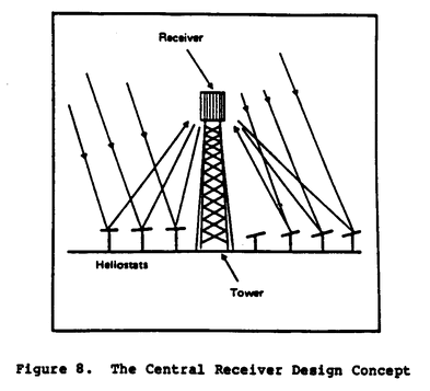 illustrates the central receiver concept wherein heliostats (flat or slightly curved mirrors mounted on tracking devices) redirect the sun's rays toward a receiver atop a tower. A 10-megawatt electrical generating plant employing this principle has been successfully operated in California since 1982.