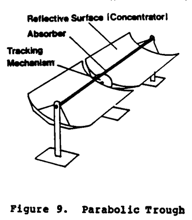 A significant number of parabolic troughs have been designed, built, and tested, primarily with private funds. Many types are available on the market. Troughs differ in their reflective materials, structural materials, receiver concepts, etc. The attainable temperature reaches about 540 [degrees] C (1000 [degrees] F). The designs vary with intended temperature application, since surface error, tracking error, and receiver losses assume considerable importance for a high temperature design.