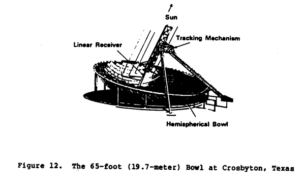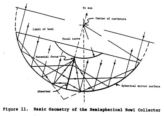 focal optics. Unlike the trough or lens, two-axis tracking is mandatory. The hemispherical bowl is always fixed, and the receiver does the tracking. The focal line falls on the line connecting the center of the sphere with the sun. The focal line is restricted to the lower half of the radius by the optical properties of the bowl. Because some rays reach the focal line with only one reflection and others require multiple reflections, the intensity is not uniform along the length of the focal line. Figure 12 shows a 65-foot (19.7-meter) diameter experimental bowl