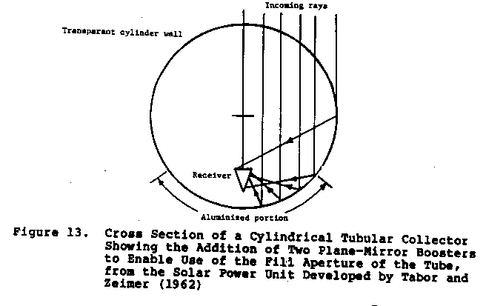 plate collector with booster mirrors are examples of concentrators that are non-focusing. Non-focusing concentrators do not focus sunlight into a specific geometrical shape, but reflect sunlight onto a receiver, thus increasing the total amount of sunlight received. The category of non-focusing concentrators also includes concentrators in which the focus is of poor quality. The cylindrical collector (Figure 14), a variation of the