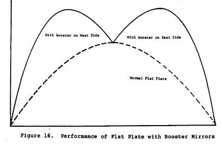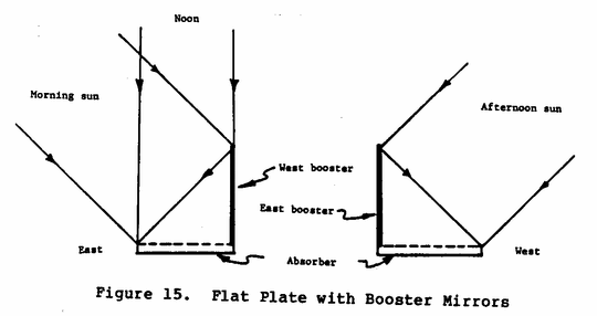 A simple method of achieving a modest increase in concentration on a large area is to use booster mirrors in conjunction with a flat plate collector (Figure 15). Before noon the mirrors face