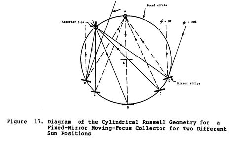 Like the hemispherical bowl, the Russell concentrator is fixed and the receiver must track the sun's image (Figure 17). This