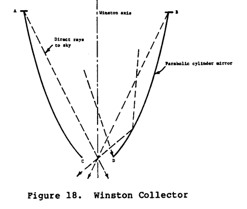 gaining simplicity of manufacture with some performance penalty. Similarly, flat reflectors can substitute for the parabolic sides of the Winston trough collector.
