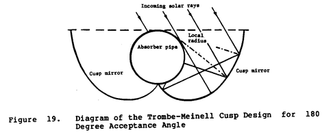 There are many ingenious concentrators that work quite well and can be cost effective in some applications. The cusp collector (Figure 19), whose surface geometry is the locus of the position