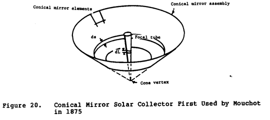 of the end of a string as it is unwrapped from a pipe can provide a modest concentration suitable for hot water. A conical collector (Figure 20) can be substituted for the Winston paraboloid,