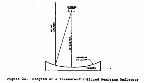 2. Pressure-stabilized membrane. The reflective surface is attached to a flexible membrane, which takes the shape of a rigid, curved support structure by creation of a vacuum between the membrane and structure. The intent is to reduce cost by reducing weight of materials of construction (Figure 22).