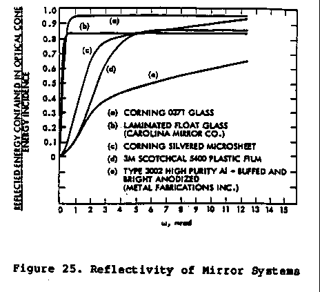 receipt of the reflected rays. If a larger solid angle is required to enclose the reflection, then a compromise between target size and loss of reflected rays must be made. Energy which is not reflected is converted to heat at the reflecting surface. This may require positive cooling efforts to ease or eliminate thermal stress.
