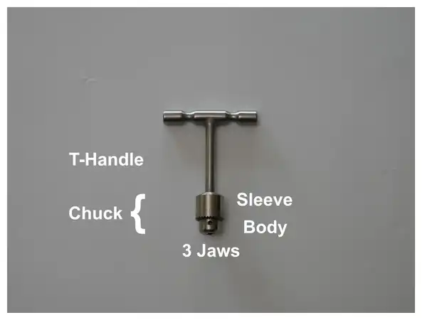 Inserted into the circular opening in the chuck body and used to tighten or loosen the 3 jaws of the universal chuck with T-handle over the Schanz screw | Yes | Can be loaned by a local facility that performs orthopedic surgical procedures |
