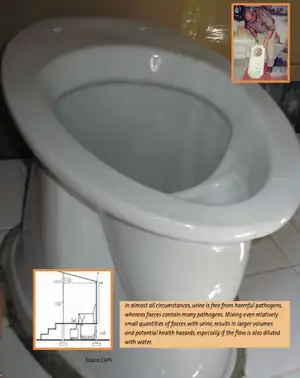 There are also 3-hole separating toilets that allow anal cleansing water to be separated from the urine and the faeces into a third, dedicated hole. It is important that the faeces remain separate and dry. When the toilet is cleaned with water, care should be taken to ensure that the faeces are not mixed with water.