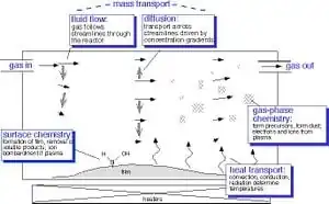CVD relies on chemical reactivity between ionized vaporized gas within the deposition chamber. Ionized gas is injected through control valves into the deposition chamber where a chemical reaction occurs between the precursor and substrate.[3]
