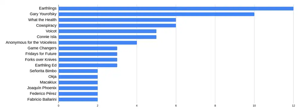 Nota: solo se incluyen documentales/activistas/influencers que dos o más personas mencionaron. Esta pregunta se agregó a mitad de la encuesta por lo que la información disponible es más limitada.