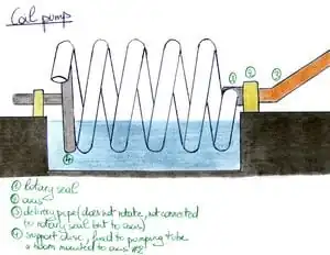 A coil pump is a low lift pump which is composed of a tube, shaped as a coil and mounted on a rotating axle powered by an engine or an animal capable of turning the axle around rapidly. Due to the rotation, water is then picked up by the tube and pumped upwards in the hose.